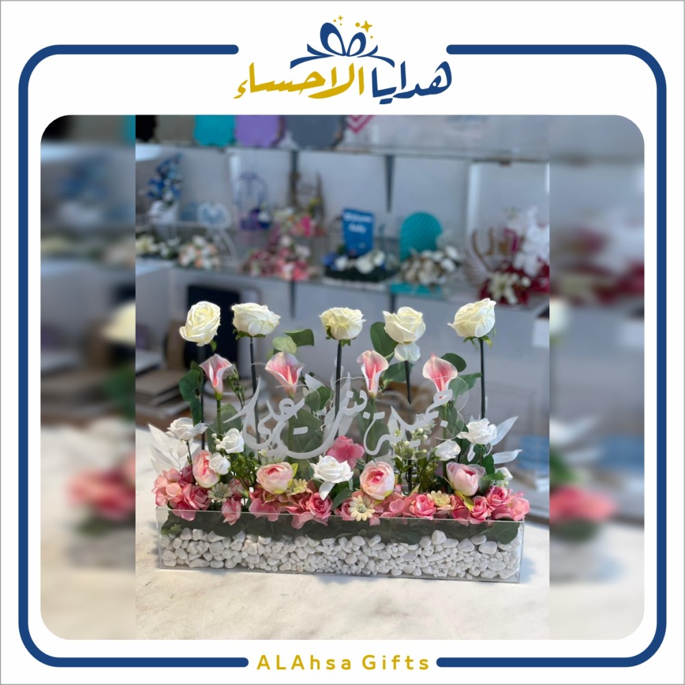 صينية اكريلك + تنسيق ورد + تغريسة اسم